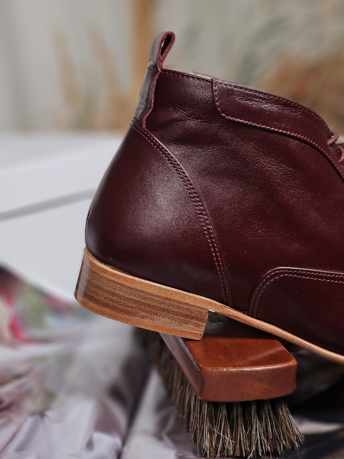 Each model has specific heel options available in its product selector. Our heels are either leather-covered or wooden, but even our covered heels have a solid wooden core inside. We never use plastic, ensuring each pair feels stable and natural underfoot.
