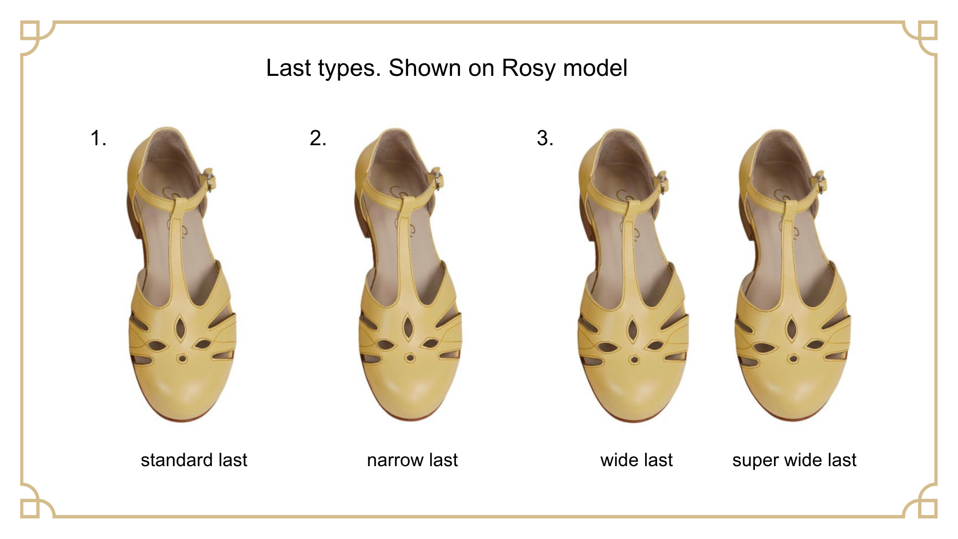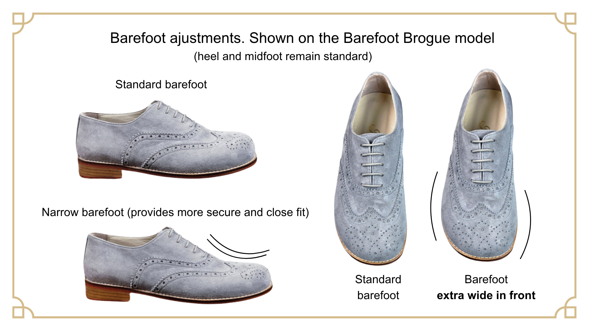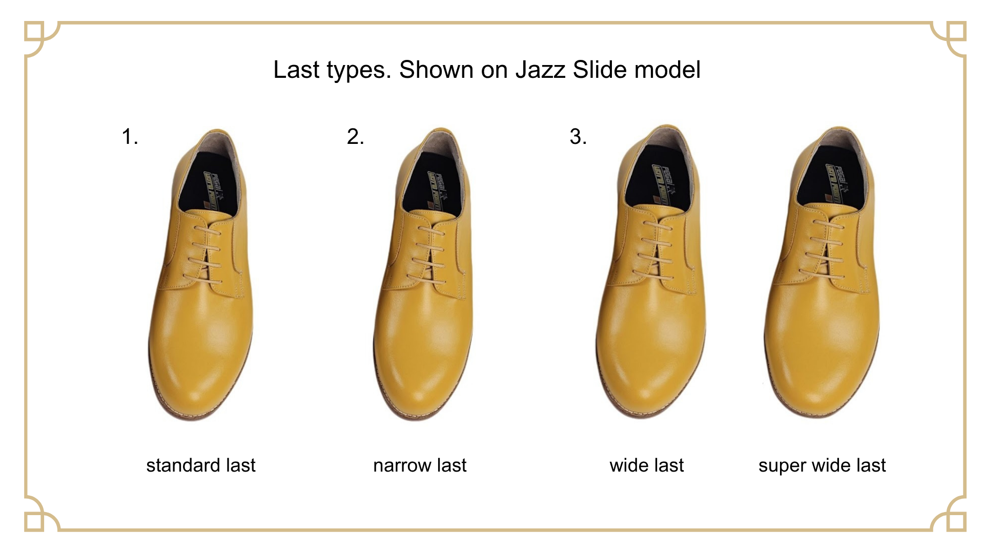 We use a medium-width barefoot last as a standard base, chosen as the most versatile and comfortable shape for movement and dancing.