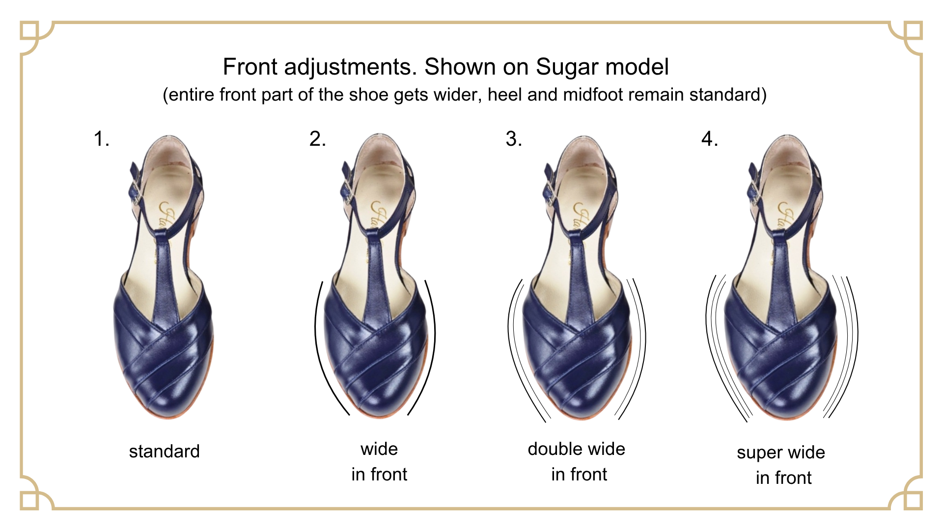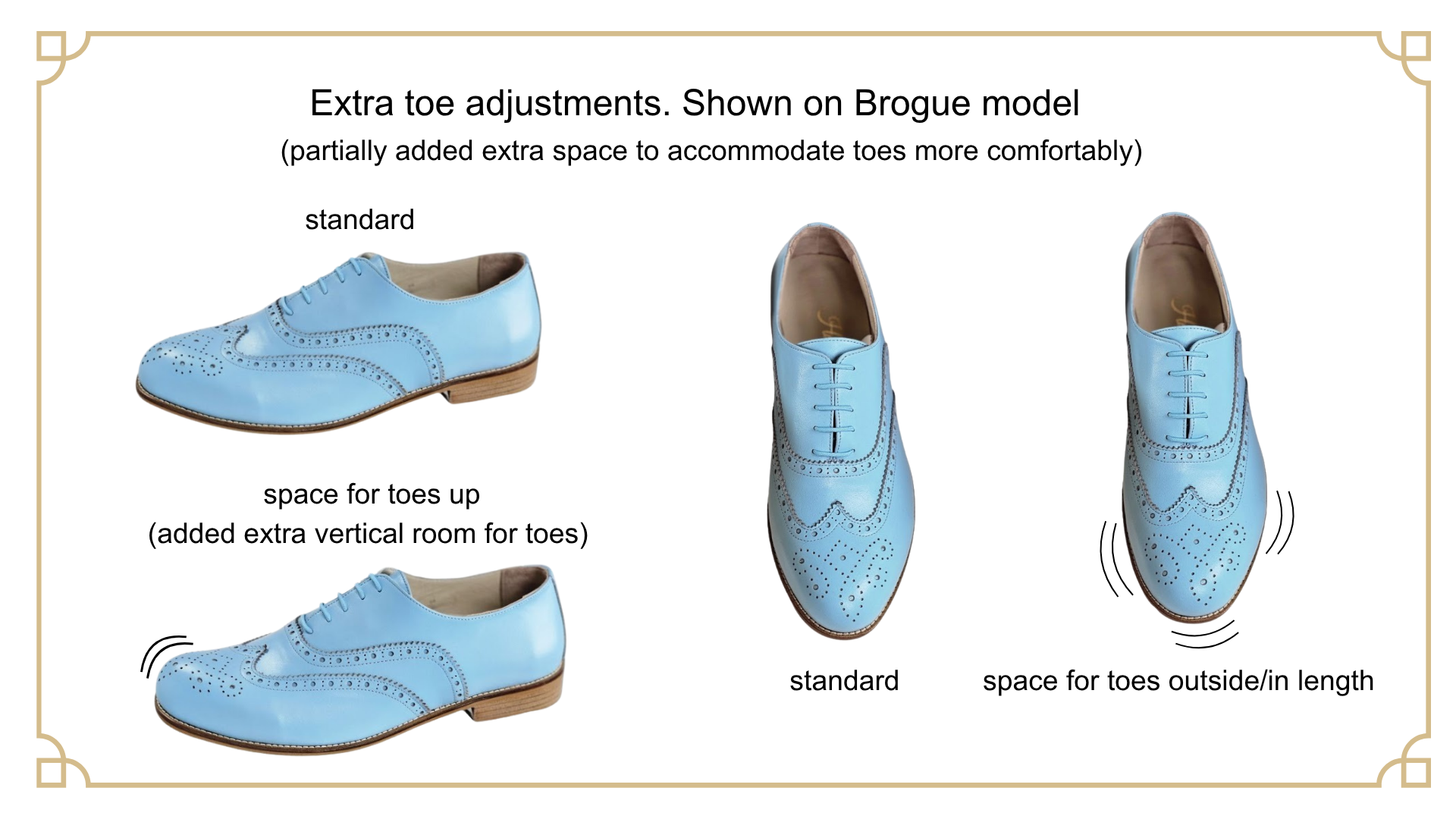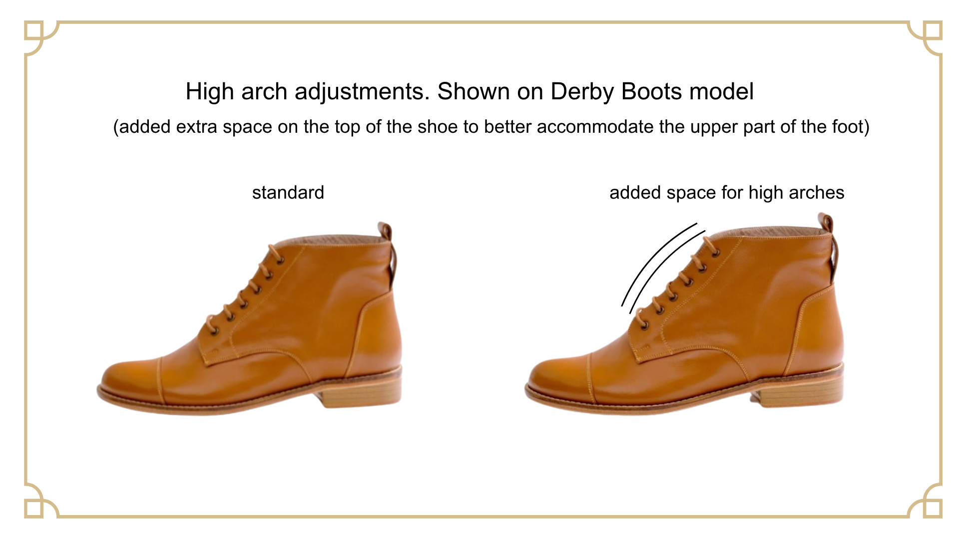 All of the options above — Standard, Narrow, Wide, Super Wide, Wide or Double Wide in Front or Super Wide Front, Space for Toes, Space for Big Toe, Space for Big Toe Outside, High Arch, Deep / Space for Insole — preserve the classic elegant “pointy” silhouette of Harlem Shoes. Each of these adjustments can also be combined with one another to achieve a balanced fit, depending on the specific needs of your feet.