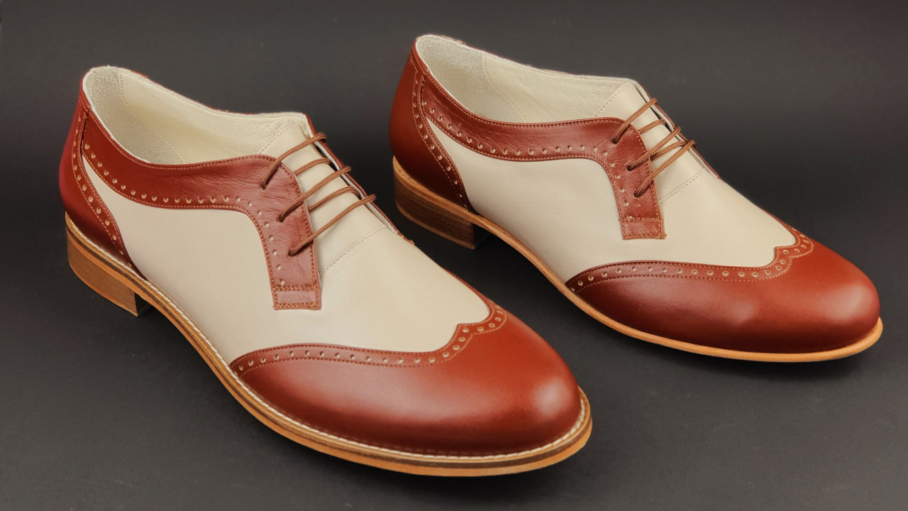 The leather sole is ideal for swing dancing indoors due to its slippery nature. However, we do not recommend using it outdoors, as the sole will get dirty and lose its slipperiness. Please note that this is a leather sole, not a suede sole. Dancers prefer leather soles for their smoothness, which facilitates easy turns and slides, thus reducing the risk of knee and wrist injuries. The shoes with leather soles are fully leather, but customers can request rubber heels for better braking. To make this request, please include it in the order comments or email us at [email protected].
